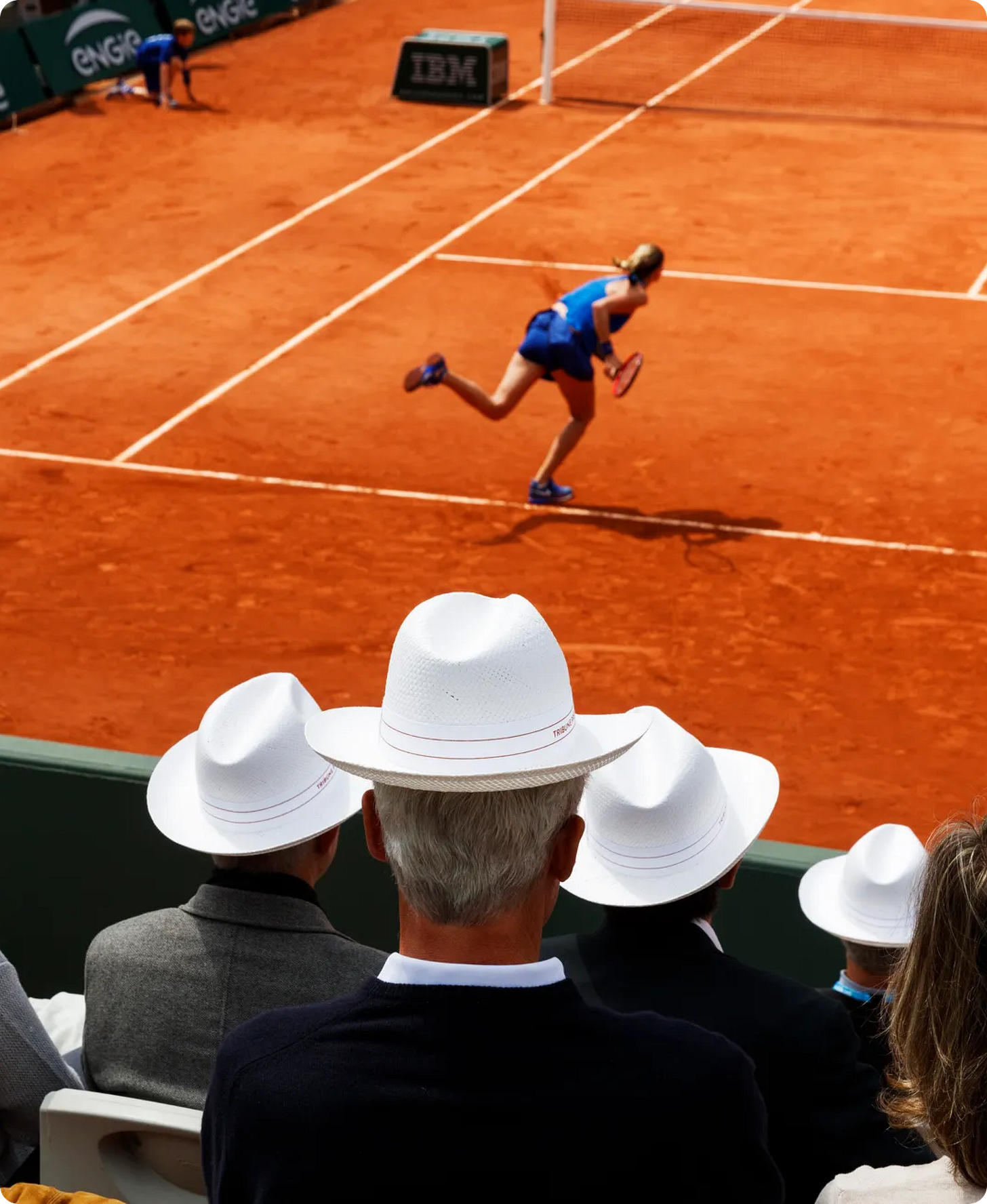 Later in life, Parr took on the challenge of documenting the four major tennis tournaments, traveling to London, Melbourne, Paris, and New York City. Generally, photographers who visit sports tournaments focus on big moments on court, aiming to capture athlete’s emotion or acrobatic action shots. Parr turned his lens to the crowd.